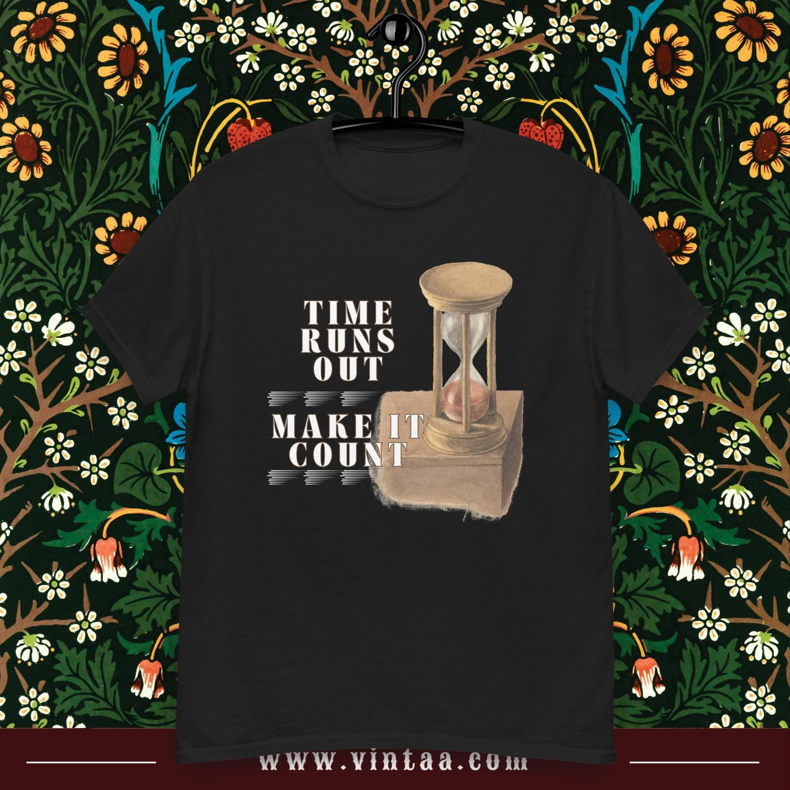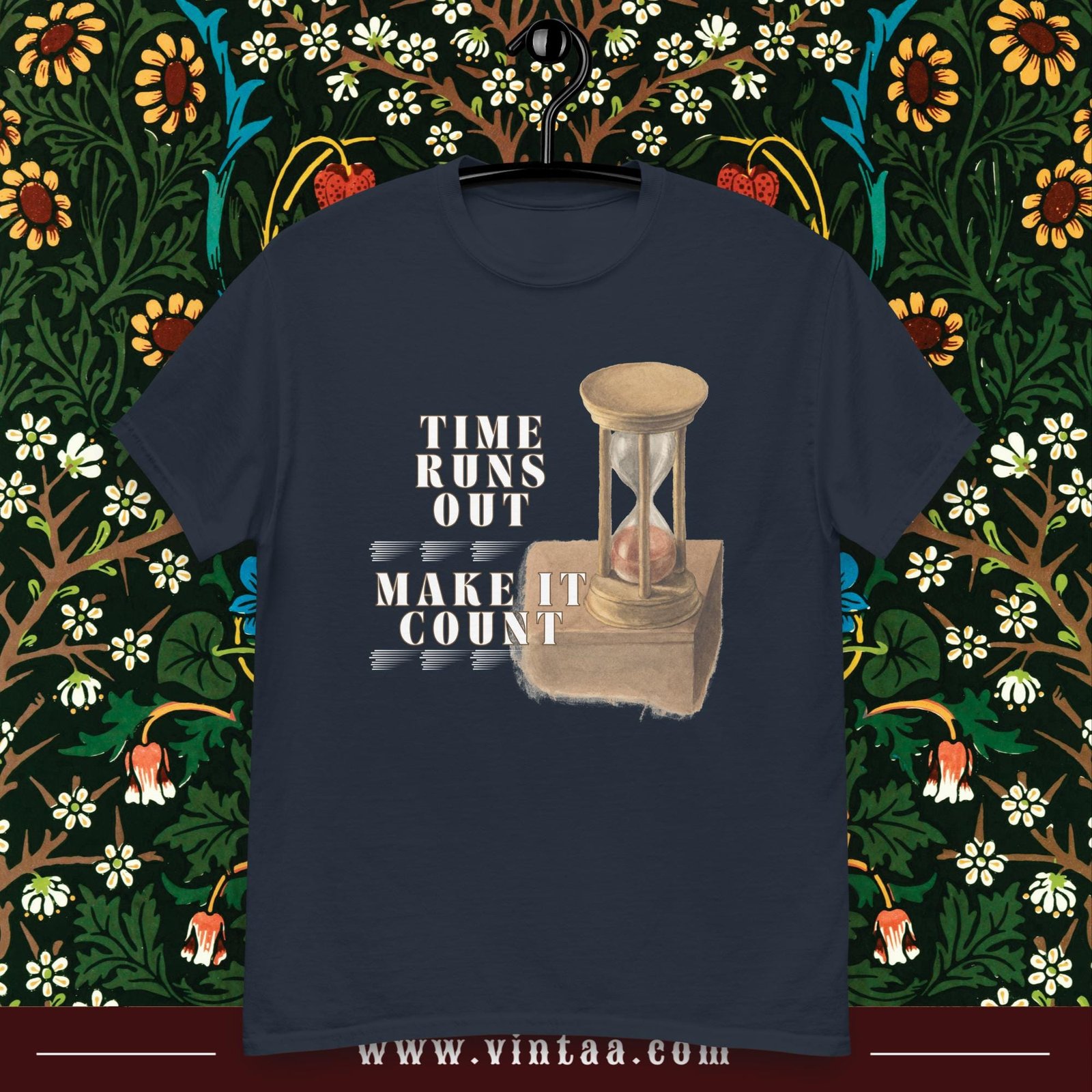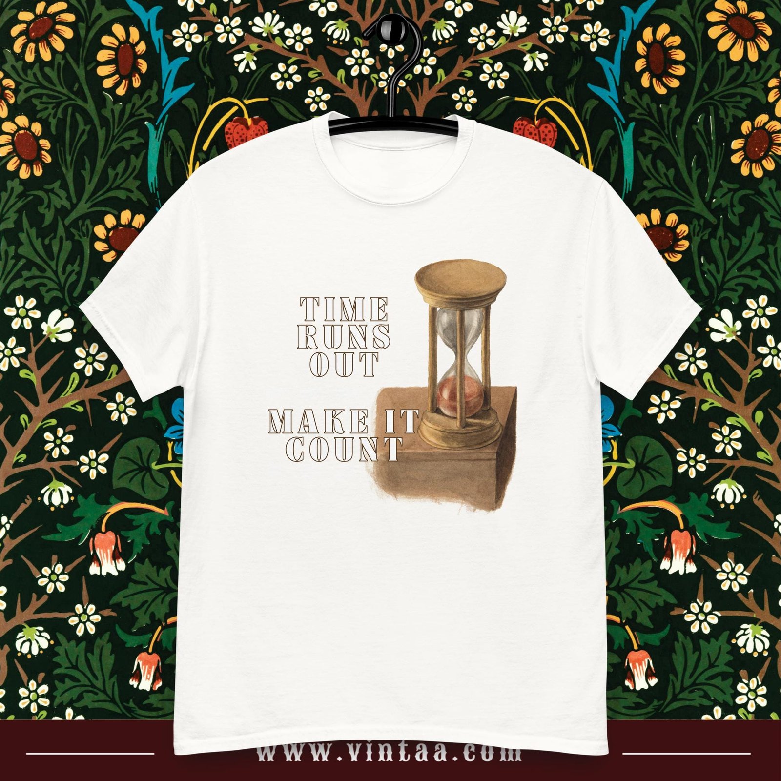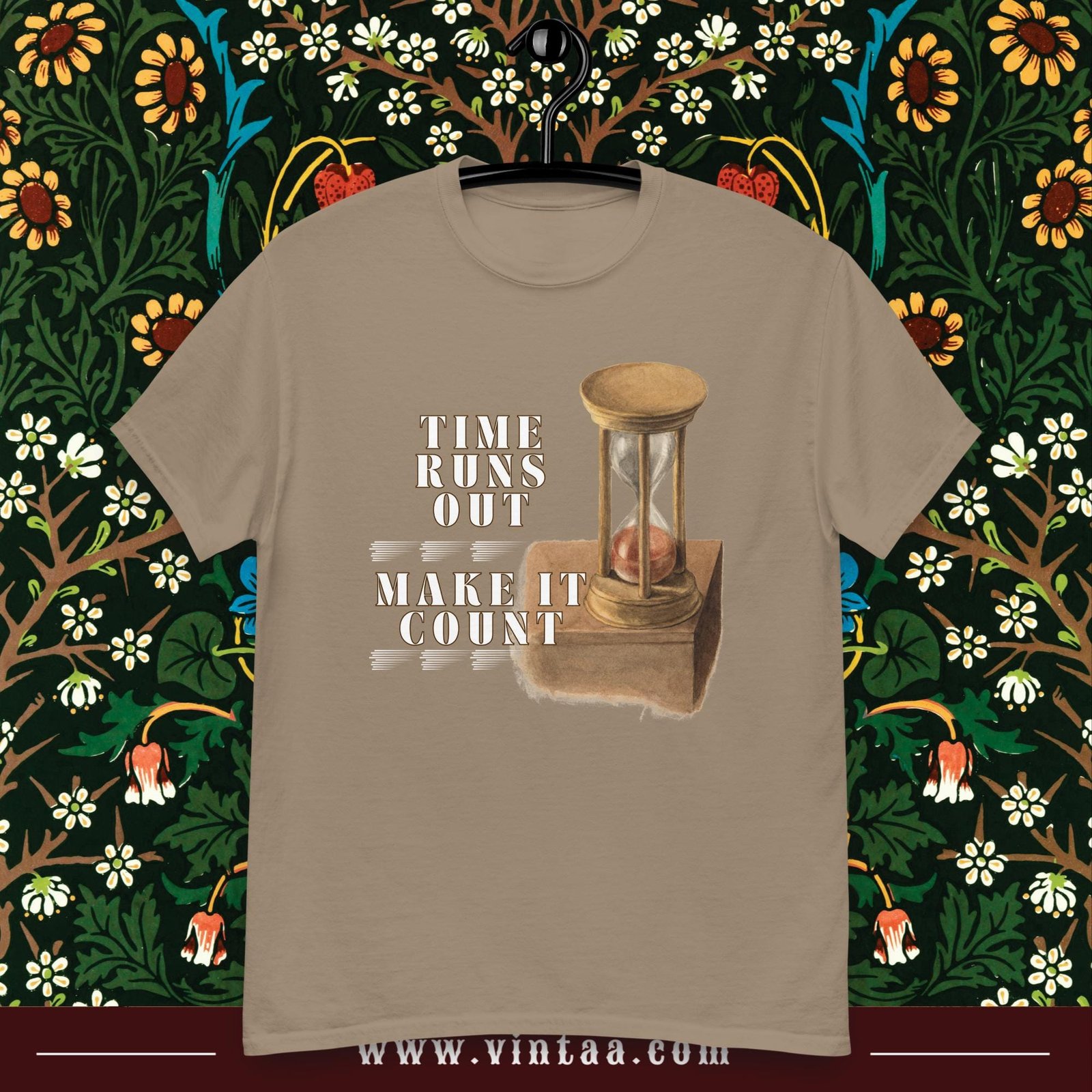 Vintage hourglass t-shirt with inspiring quote “Time runs out, make it count.” Retro design reminding us to value every moment.