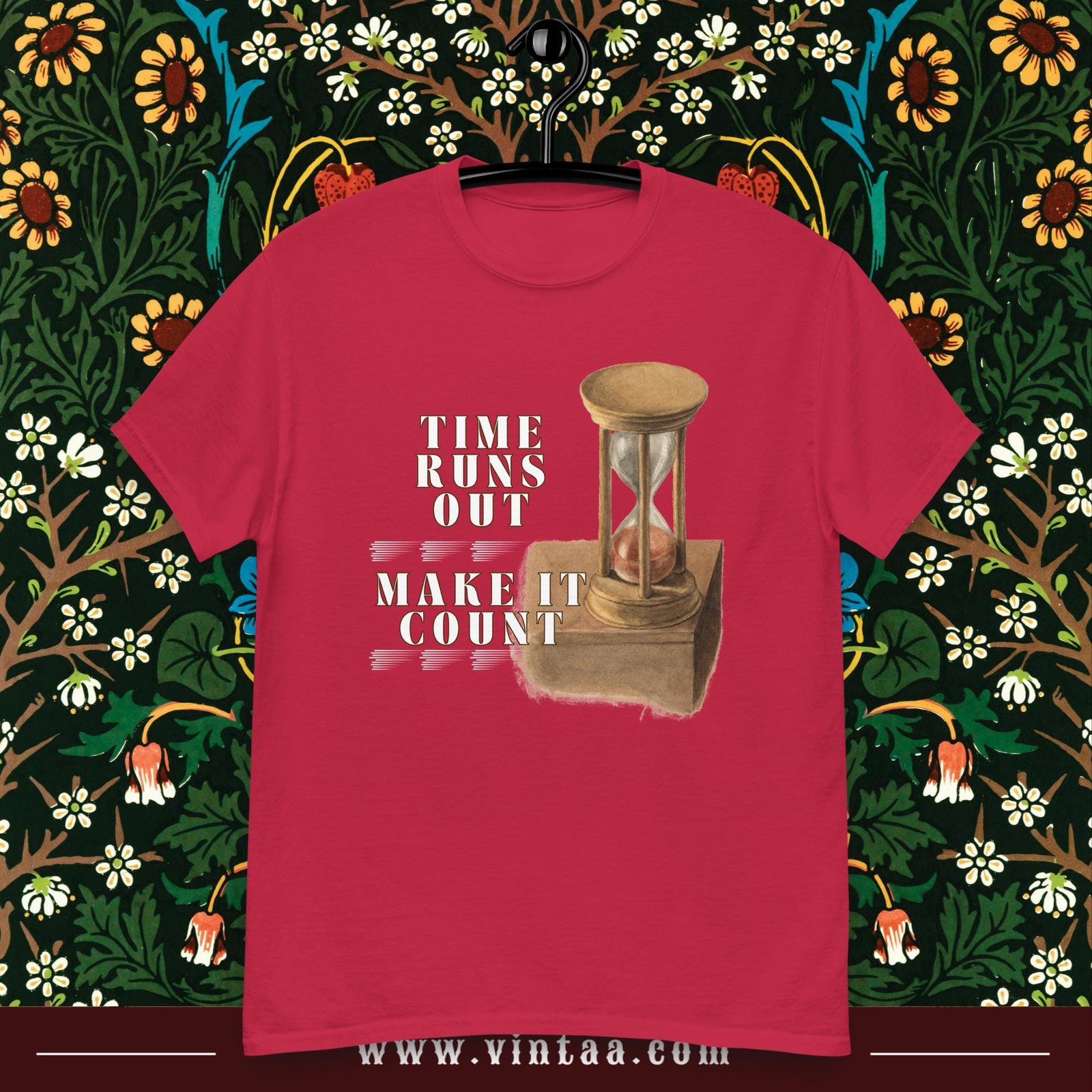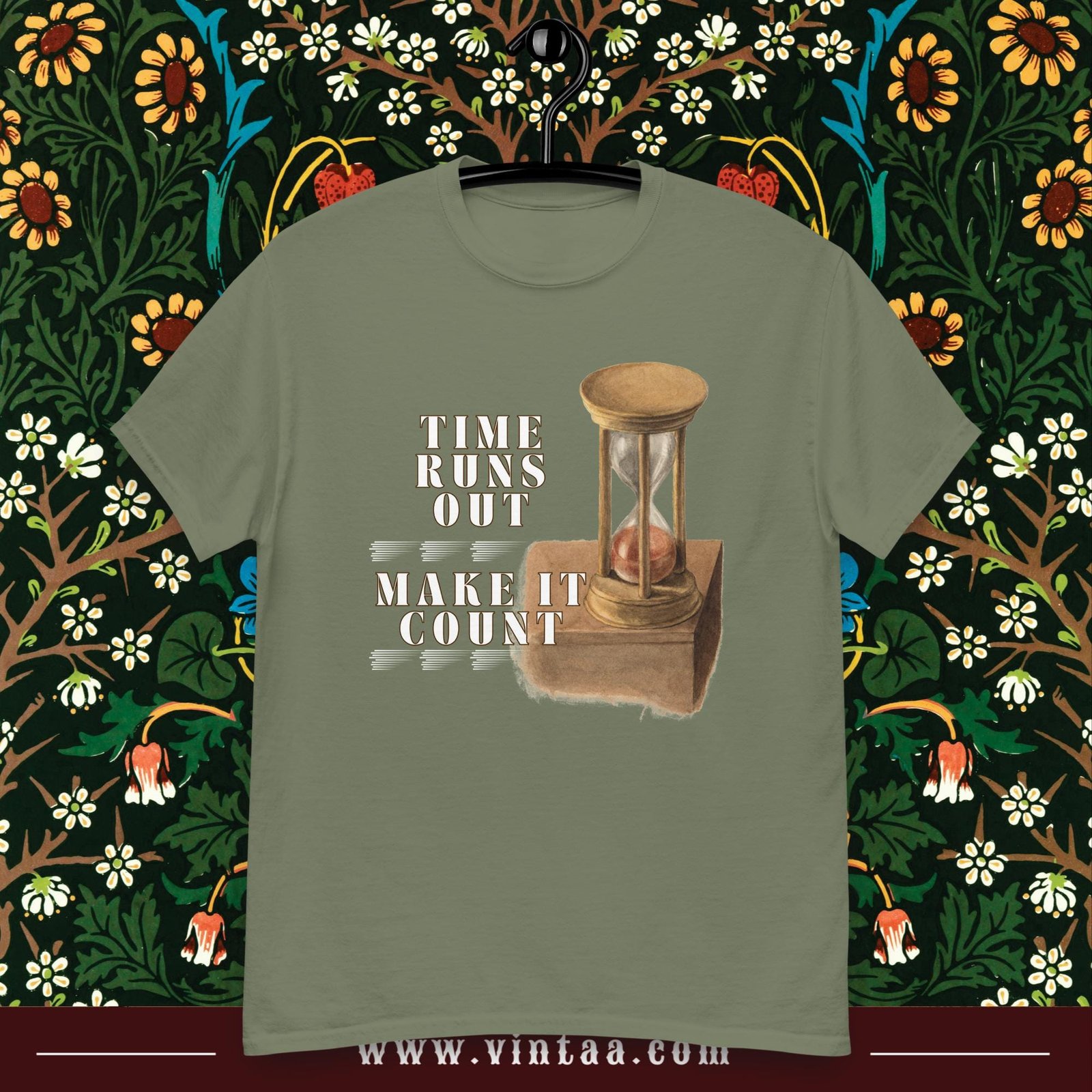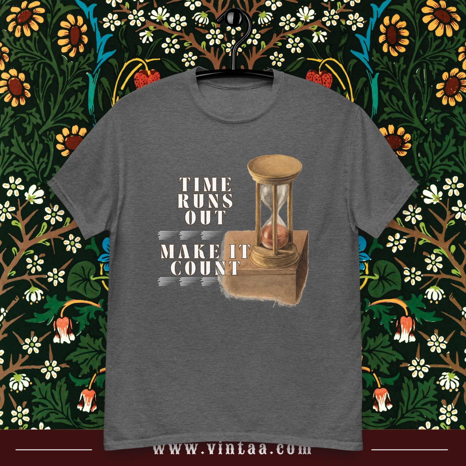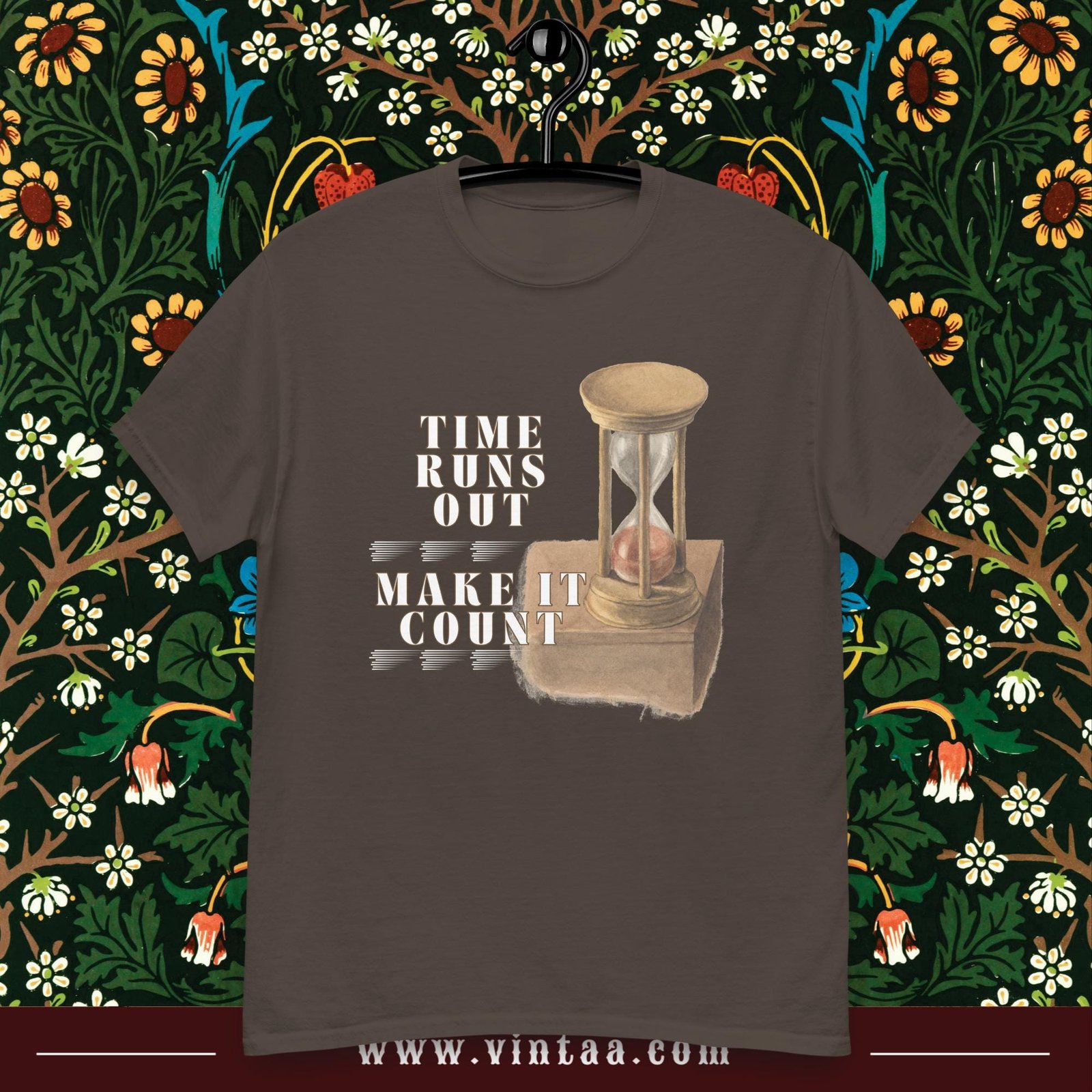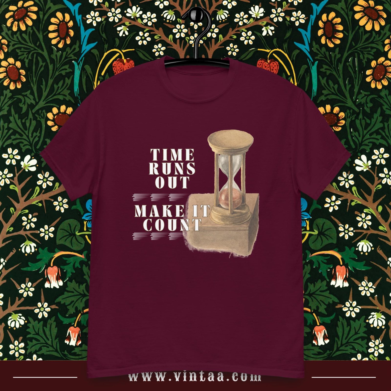 Vintage hourglass t-shirt with inspiring quote “Time runs out, make it count.” Retro design reminding us to value every moment.